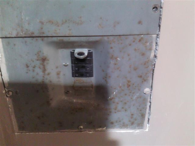 The sub-panel was badly corroded and had no identifying stickers or information. We can see (photo below) that it was probably salvaged from another building where is was exposed to water. Corroded or water-damaged panels are always a safety hazard, as rusted metal can overhead or arc, causing a fire.