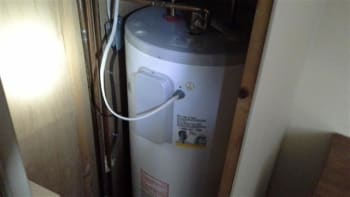 The electric hot water tank was located in the bedroom closet. At 13 years old (and starting to corrode), it had reached the end of its expected service life. These tanks typically last 8-12 years, and the GE-brand tanks tend to fail earlier due to their poor quality control. This will cost about $800 to replace.
