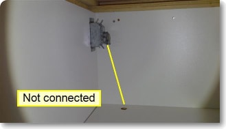 A quick look inside the cabinet, and we can see that it’s a “dummy” receptacle which wasn’t even connected! The owner had started to install one (including drilling a hole through the floor for the wiring), and never finished. This is why we always check every receptacle when possible. (Note: The island was not installed permanently; it was free moving and could be slid around on the floor. Be careful to check if your island is secured before you buy).