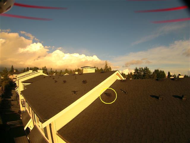 Flying the Drone at the height of the ridge line, we snapped a few detailed photos in the evening light. In the following photo we can see a broken grill on the flashing (circled).